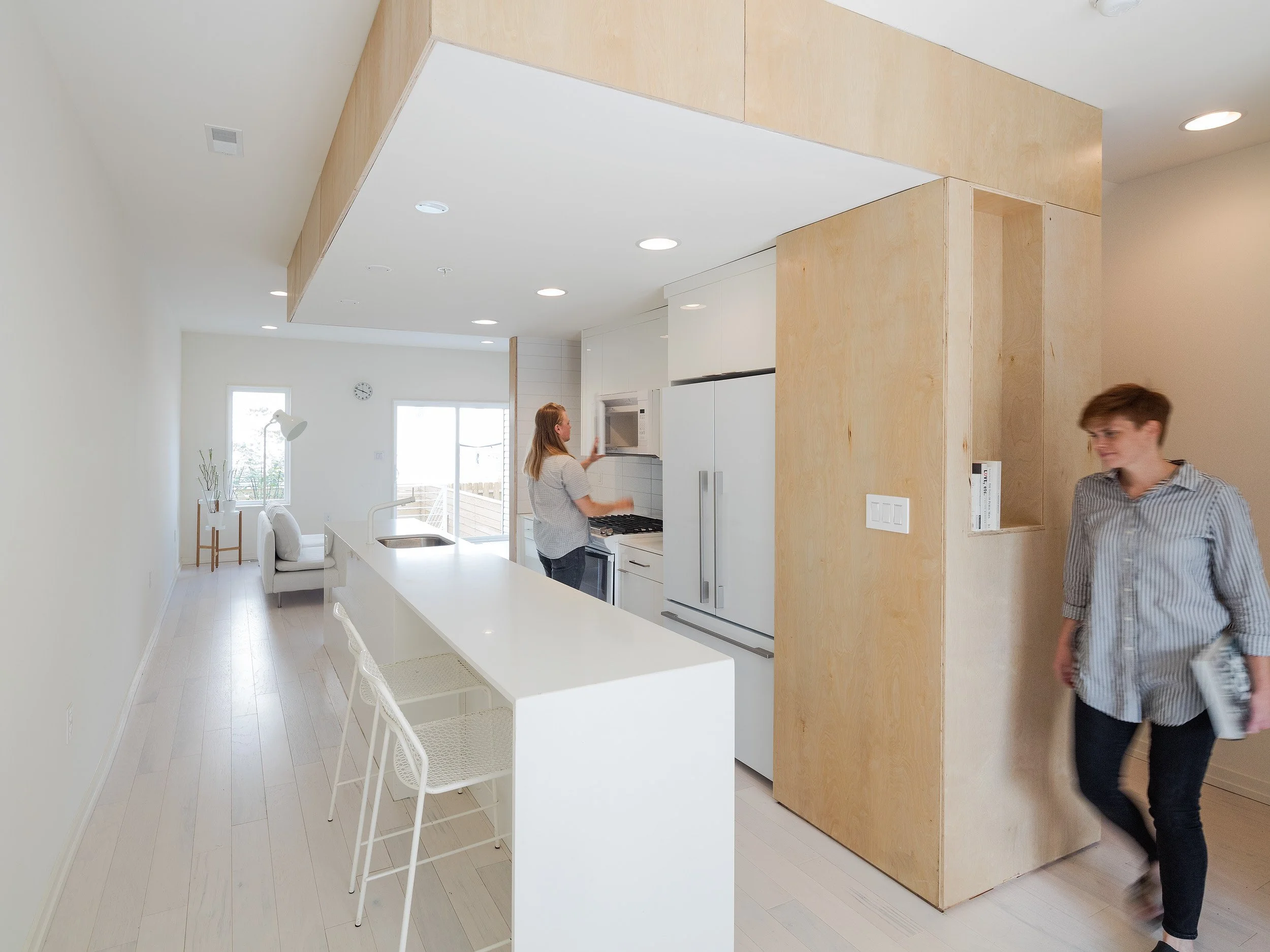 Not your traditional Philadelphia Rowhouse, this award-winning project's interior plan is organized around a striking vertical birch plywood-clad volume feature, creating a minimally cool and clean living aesthetic.